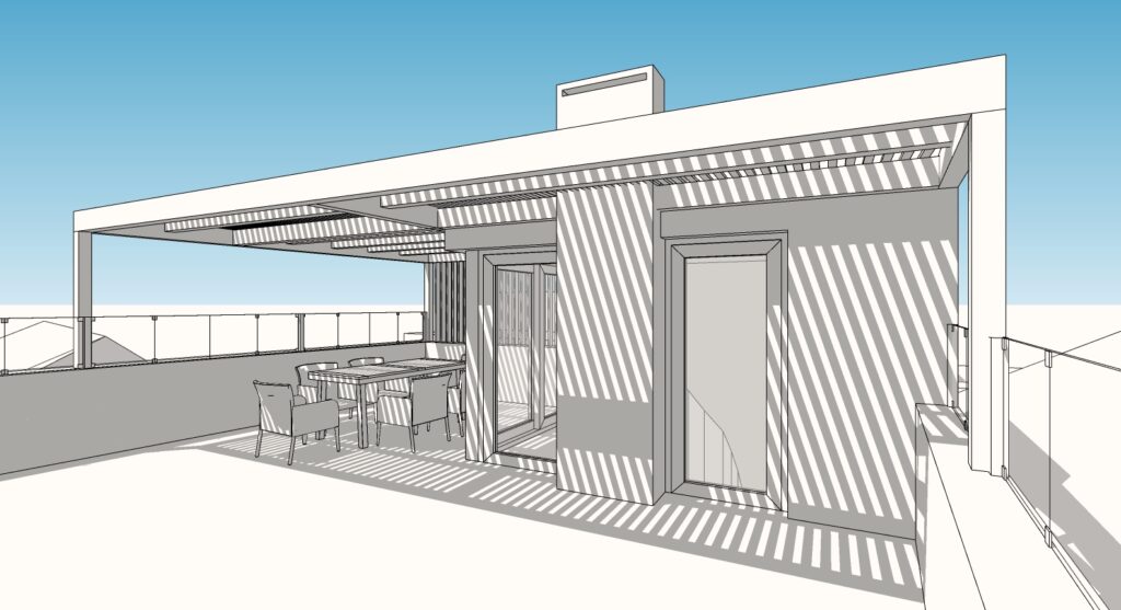 O terraço na cobertura será um espaço de fruição, com vista de 360º. A integração de uma pérgula trará o sombreamento necessário aos dias de verão - situação caracterizada na fase de licenciamento e no projeto de execução.