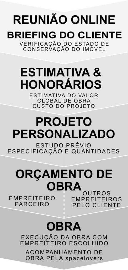 A spacelovers elabora projetos de remodelação de interiores antes da apresentação de orçamento final de obra. Desta forma, garantimos a qualidade dos trabalhos, e satisfação dos clientes, pela antecipação do resultado da obra, ainda em fase de projeto. O desenvolvimento do projeto tem um custo inicial ajustado à sua remodelação.